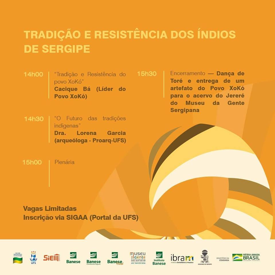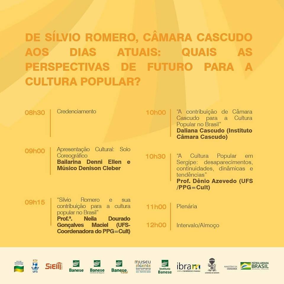 A programação do evento será dividida em dois momentos que se complementam. No período da manhã será realizada uma discussão sobre o tema ‘De Sílvio Romero, Câmara Cascudo aos dias atuais: Quais as perspectivas de futuro para a cultura popular?’ Será uma homenagem à memória do sergipano Sílvio Romero e do antropólogo e historiador Câmara Cascudo, com a participação da professora Neila Dourado Gonçalves Maciel (UFS – Coordenadora do PPG=Cult) e de Daliana Cascudo, do Instituto Câmara Cascudo. Durante a tarde haverá uma palestra ministrada pela Dra. Lorena Garcia, arqueóloga e professora do departamento de arqueologia da Universidade Federal de Sergipe (UFS), sobre a tradição e resistência dos índios de Sergipe”.
